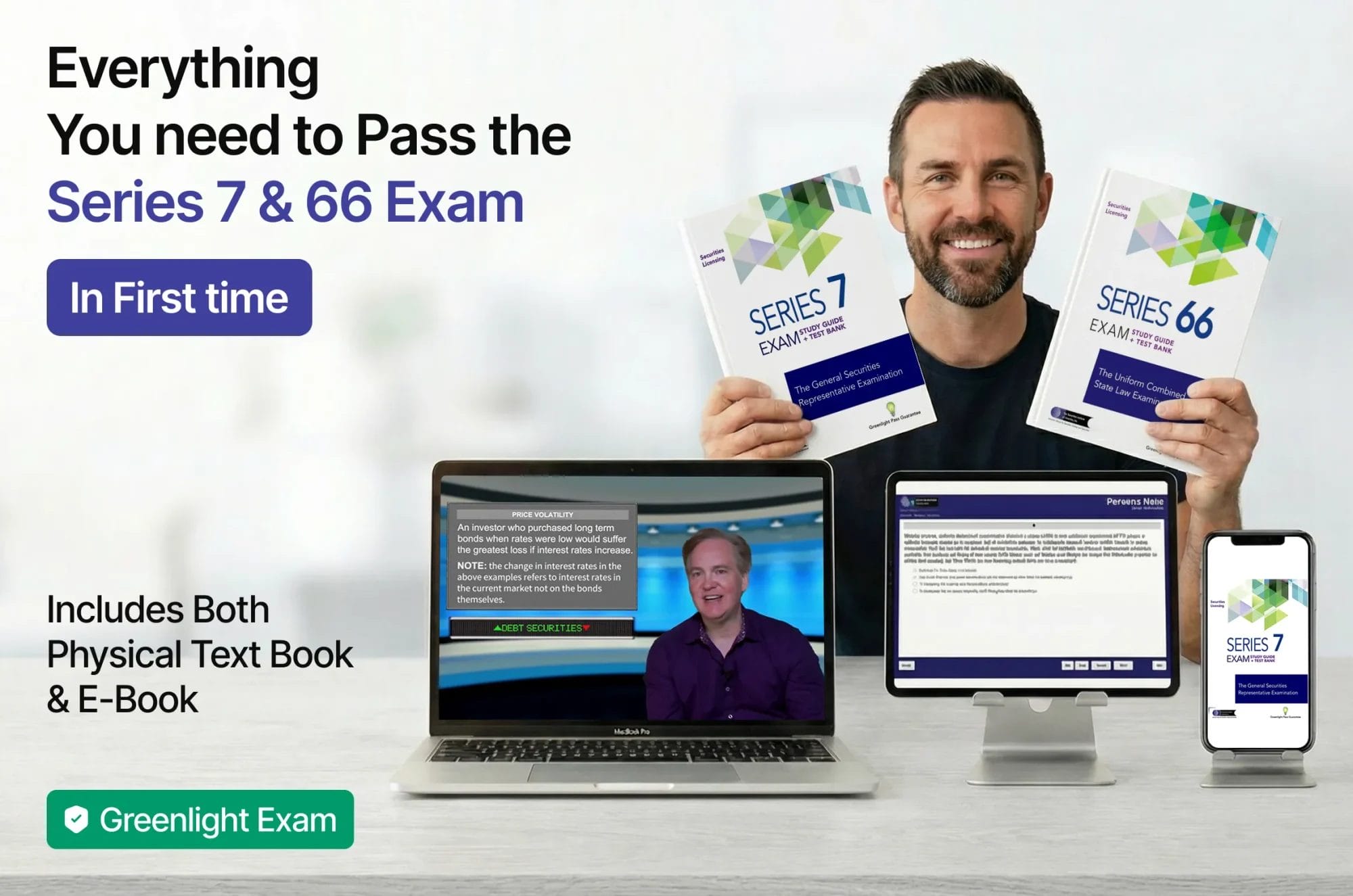 The series 7 & 66 complete video package is packed with more than 28 hours of HD video. More than 8,000 practice questions to ensure you are ready to pass both exams. All training is accessible from any computer, phone or tablet. This package comes complete with our GreenLight money back pass guarantee. Scroll images to learn more.